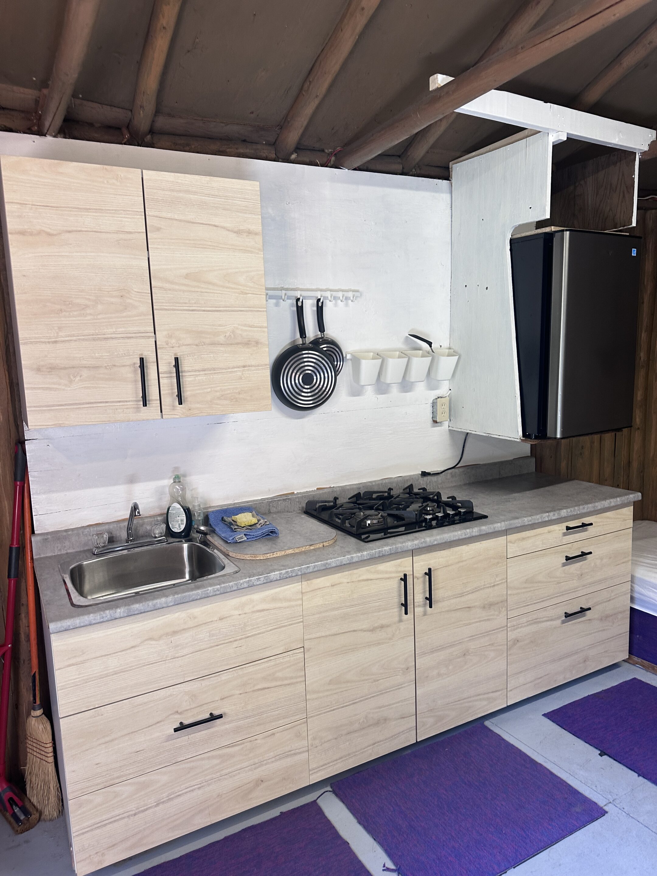 Hand crafted log construction from our forest, our main lodge building features a commercial kitchen, dining & lounge area, tackle shop, laundry facilities, hot and cold running water, showers, flush toilets and electrical power.